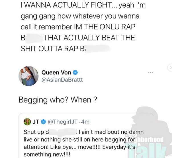 In response to Asian's tweet, "Glad I BEEN pretty my WHOLE LIFE 😍" JT mentioned it and said, "Get a PRETTY hit record h*e, buoy got the RIGHT one!" This quickly incited a back & forth of firing shots of all kinds- almost too many to share since they've nearly all have been deleted; but here's some: